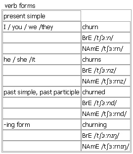 churn [churn churns churned churning] verb, noun BrE [tʃɜːn] NAmE [tʃɜːrn] verb 1. intransitive, transitive if water, mud, etc. churns, or if sth churns it (up), it moves or is moved around violently •~ (up) The water churned beneath the huge ship. •~ sth (up) Vast crowds had churned the field into a sea of mud. 2. intransitive, transitive ~ (sth) if your stomach churns or if sth churns your stomach, you feel a strong, unpleasant feeling of worry, disgust or fear •My stomach churned as the names were read out. 3. intransitive, transitive ~ (sb) (up) to feel or to make sb feel upset or emotionally confused •Conflicting emotions churned inside him. 4. transitive ~ sth to turn and stir milk in a special container in order to make butter Verb forms: Word Origin: Old English cyrin, of Germanic origin; related to Middle Low German kerne and Old Norse kirna. Derived: ↑churn something out noun 1. a machine in which milk or cream is shaken to make butter 2. (BrE)a large metal container in which milk was carried from a farm in the past Word Origin: Old English cyrin, of Germanic origin; related to Middle Low German kerne and Old Norse kirna.