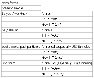 fun·nel [funnel funnels funnelled funneled funnelling funneling] noun, verb BrE [ˈfʌnl] NAmE [ˈfʌnl] noun  1. a device that is wide at the top and narrow at the bottom, used for pouring liquids or powders into a small opening 2. (BrE) (also smoke·stack NAmE, BrE)a metal ↑chimney, for example on a ship or an engine, through which smoke comes out Word Origin: late Middle English: apparently via Old French from Provençal fonilh, from late Latin fundibulum, from Latin infundibulum, from infundere, from in- ‘into’ + fundere ‘pour’. verb (-ll-, especially US -l-)intransitive, transitive to move or make sth move through a narrow space, or as if through a ↑funnel •(+ adv./prep.) Wind was funnelling through the gorge. •~ sth (+ adv./prep.) Huge pipes funnel the water down the mountainside. •Barricades funnelled the crowds towards the square. • (figurative)Some $10 million in aid was funnelled into the country through government agencies. Verb forms: Word Origin: late Middle English: apparently via Old French from Provençal fonilh, from late Latin fundibulum, from Latin infundibulum, from infundere, from in- ‘into’ + fundere ‘pour’. See also: ↑smokestack