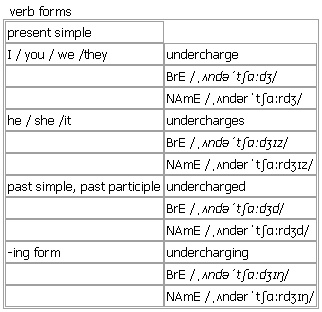 under·charge [undercharge undercharges undercharged undercharging] BrE [ˌʌndəˈtʃɑːdʒ] NAmE [ˌʌndərˈtʃɑːrdʒ] verb intransitive, transitive ~ (sb) (for sth) to charge too little for sth, usually by mistake Opp: ↑overcharge Verb forms:
