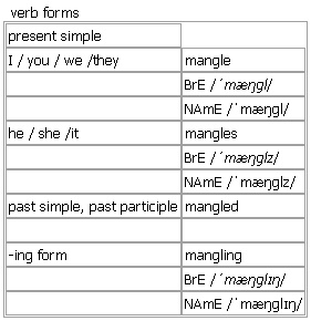 man·gle [mangle mangles mangled mangling] verb, noun BrE [ˈmæŋɡl] NAmE [ˈmæŋɡl] verb usually passive 1. ~ sth to crush or twist sth so that it is badly damaged •His hand was mangled in the machine. 2. ~ sth to spoil sth, for example a poem or a piece of music, by saying it wrongly or playing it badly Syn: ↑ruin Verb forms: Word Origin: n. late 17th cent. Dutch mangel mangelen ‘to mangle’ medieval Latin mango manga Greek manganon ‘axis, engine of war’ v. late Middle English Anglo-Norman French mahangler mahaignier ‘maim’ Derived Word: ↑mangled noun (also wring·er) a machine with two ↑rollers (1) used especially in the past for squeezing the water out of clothes that had been washed Word Origin: n. late 17th cent. Dutch mangel mangelen ‘to mangle’ medieval Latin mango manga Greek manganon ‘axis, engine of war’ v. late Middle English Anglo-Norman French mahangler mahaignier ‘maim’ See also: ↑wringer