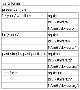 squirt [squirt squirts squirted squirting] verb, noun BrE [skwɜːt] NAmE [skwɜːrt] verb 1. transitive, intransitive to force liquid, gas, etc. in a thin fast stream through a narrow opening; to be forced out of a narrow opening in this way Syn: ↑spurt •~ sth (+ adv./prep.) The snake can squirt poison from a distance of a metre. •I desperately squirted water on the flames. •(+ adv./prep.) When I cut the lemon, juice squirted in my eye. 2. transitive to hit sb/sth with a stream of water, gas, etc. Syn: ↑spray •~ sb/sth (with sth) The children were squirting each other with water from the hose. •~ sth (at sb) He squirted a water pistol at me (= made the water come out of it). Verb forms: Word Origin: Middle English (as a verb): imitative. Example Bank: •He squirted a water pistol at me. noun 1. a thin, fast stream of liquid that comes out of a small opening Syn: ↑spray •a squirt of perfume •a squirt of ketchup on the french fries 2. (informal, disapproving)a word used to refer to a short, young or unimportant person that you do not like or that you find annoying Word Origin: Middle English (as a verb): imitative.