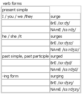 surge [surge surges surged surging] verb, noun BrE [sɜːdʒ] NAmE [sɜːrdʒ] verb 1. intransitive + adv./prep. to move quickly and with force in a particular direction •The gates opened and the crowd surged forward. •Flood waters surged into their homes. •He surged past the other runners on the last lap. 2. intransitive (+ adv./prep.) to fill sb with a strong feeling Syn: ↑sweep •Relief surged through her. 3. intransitive (of prices, profits, etc.)to suddenly increase in value •Share prices surged. related noun ↑upsurge 4. intransitive (of the flow of electrical power)to increase suddenly Verb forms: Word Origin: late 15th cent. (in the sense ‘fountain, stream’): the noun (in early use) from Old French sourgeon; the verb partly from the Old French stem sourge-, based on Latin surgere ‘to rise’. Early senses of the verb included ‘rise and fall on the waves’ and ‘swell with great force’. Example Bank: •A large wave sent water surging up towards them. •Her heart thumped and blood surged through her veins. •Inflation surged 2 500 per cent in 2006. •Profits from cigarettes surged to $225m last year. •The gates opened and the crowd surged forwards. noun 1. ~ (of sth) a sudden increase of a strong feeling Syn: ↑rush •She felt a sudden surge of anger. •a surge of excitement see also ↑upsurge 2. a sudden increase in the amount or number of sth; a large amount of sth •~ (in sth) a surge in consumer spending •We are having trouble keeping up with the recent surge in demand. •~ (of sth) After an initial surge of interest, there has been little call for our services. see also ↑upsurge 3. ~ (of sth) a sudden, strong forward or upward movement •a tidal surge •A surge of people poured through the gates. 4. a sudden increase in the flow of electrical power through a system •An electrical surge damaged the computer's disk drive. •The National Grid was hit by a huge power surge. Word Origin: late 15th cent. (in the sense ‘fountain, stream’): the noun (in early use) from Old French sourgeon; the verb partly from the Old French stem sourge-, based on Latin surgere ‘to rise’. Early senses of the verb included ‘rise and fall on the waves’ and ‘swell with great force’. Example Bank: •A last-minute surge in ticket sales saved the show from closure. •He experienced a sudden surge of excitement. •He thought of his old teacher with a surge of affection. •His initial surge of euphoria was quickly followed by dismay. •Police struggled to control the sudden surge forward by the demonstrators. •She felt a fresh surge of anger when he denied lying. •The mention of her name sent a surge of anger through me. •The storm surge caused widespread flooding. •a dramatic surge in the demand •A huge surge of emotion swept through her. •Charles felt a great surge of excitement. •Economists have reported a surge in consumer spending. •He picked up the phone with a surge of panic. •We are having trouble keeping up with the recent surge in demand